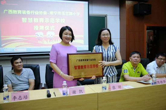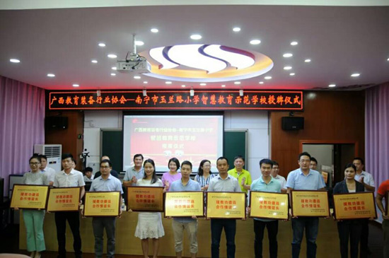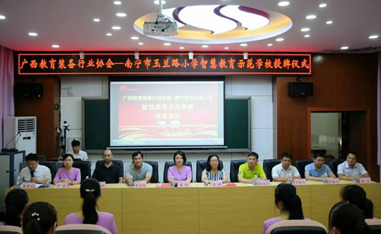 2018年6月27日上午,廣西教育裝備行業(yè)協(xié)會智慧教育示范學(xué)校掛牌儀式在南寧玉蘭路小學(xué)舉行,標(biāo)志著南寧市玉蘭路小學(xué)新時代教育信息化發(fā)展駛?cè)肓丝燔嚨,具有里程碑式重要意義。與會領(lǐng)導(dǎo)、全國教育裝備界的各知名企業(yè)代表、愛心人士、家長代表、教師代表,一同出席了活動,見證了這一歷史性的時刻。